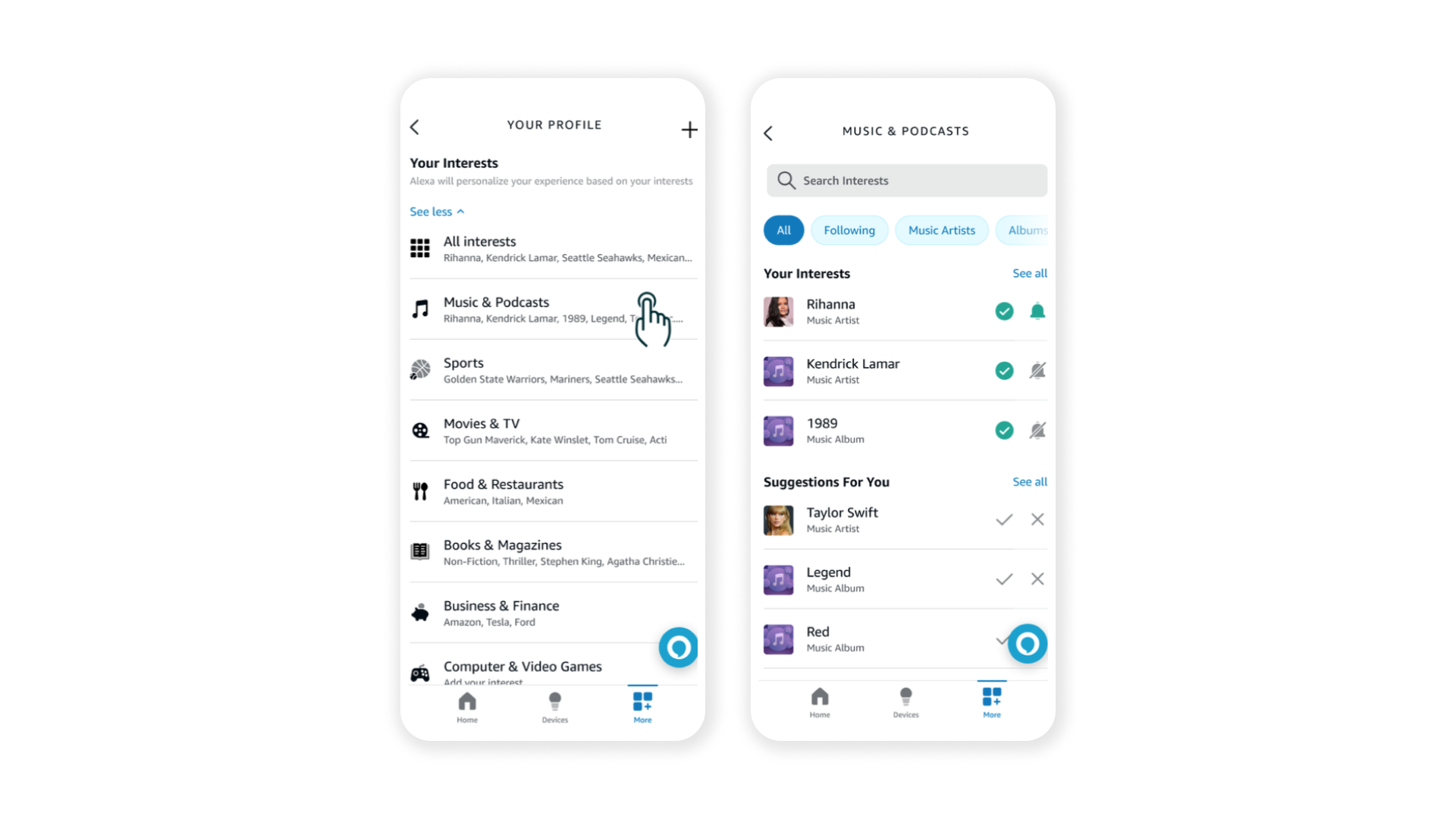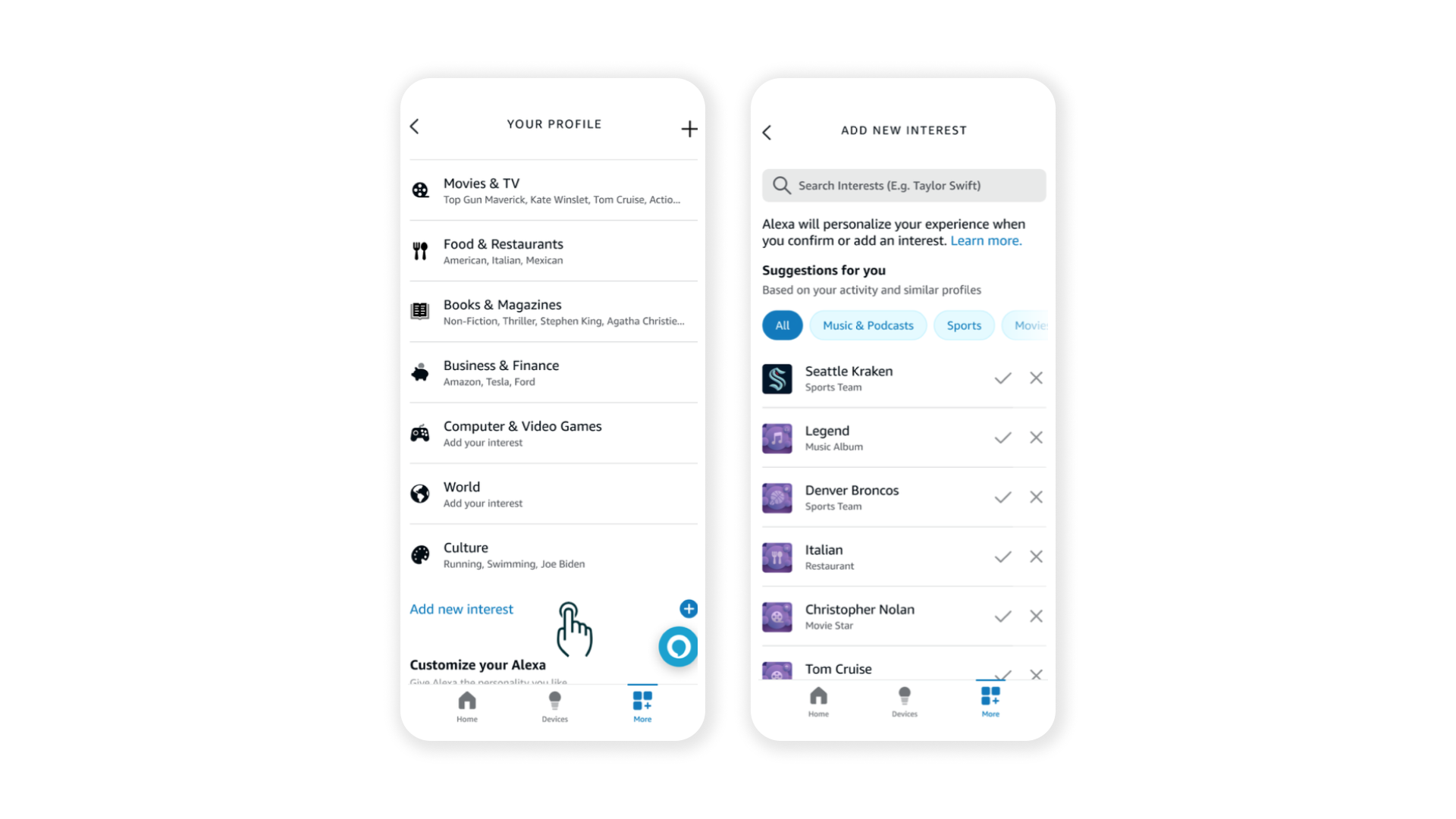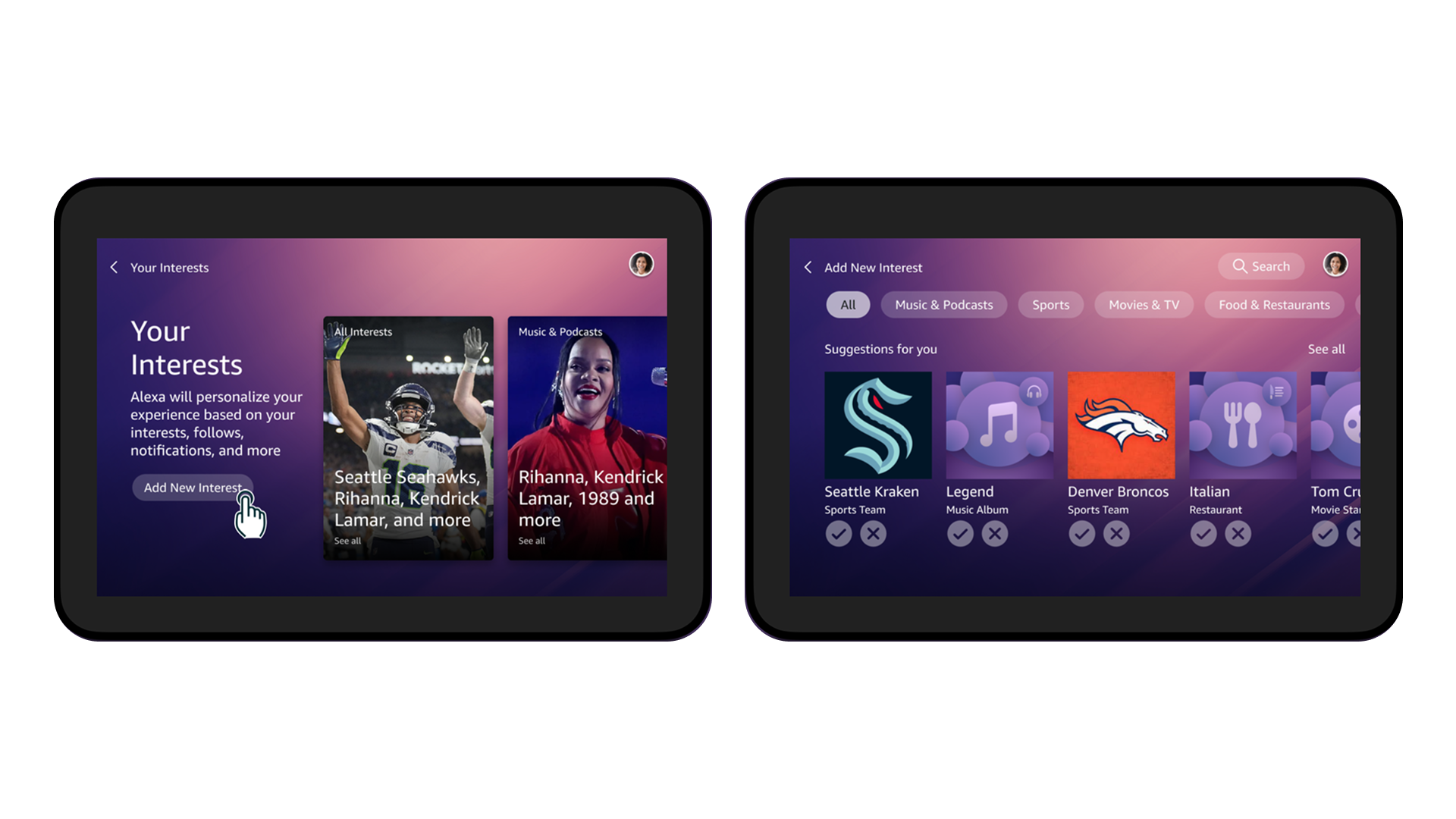 Customers can add new interests or confirm the interests that Alexa has inferred based on their interactions.