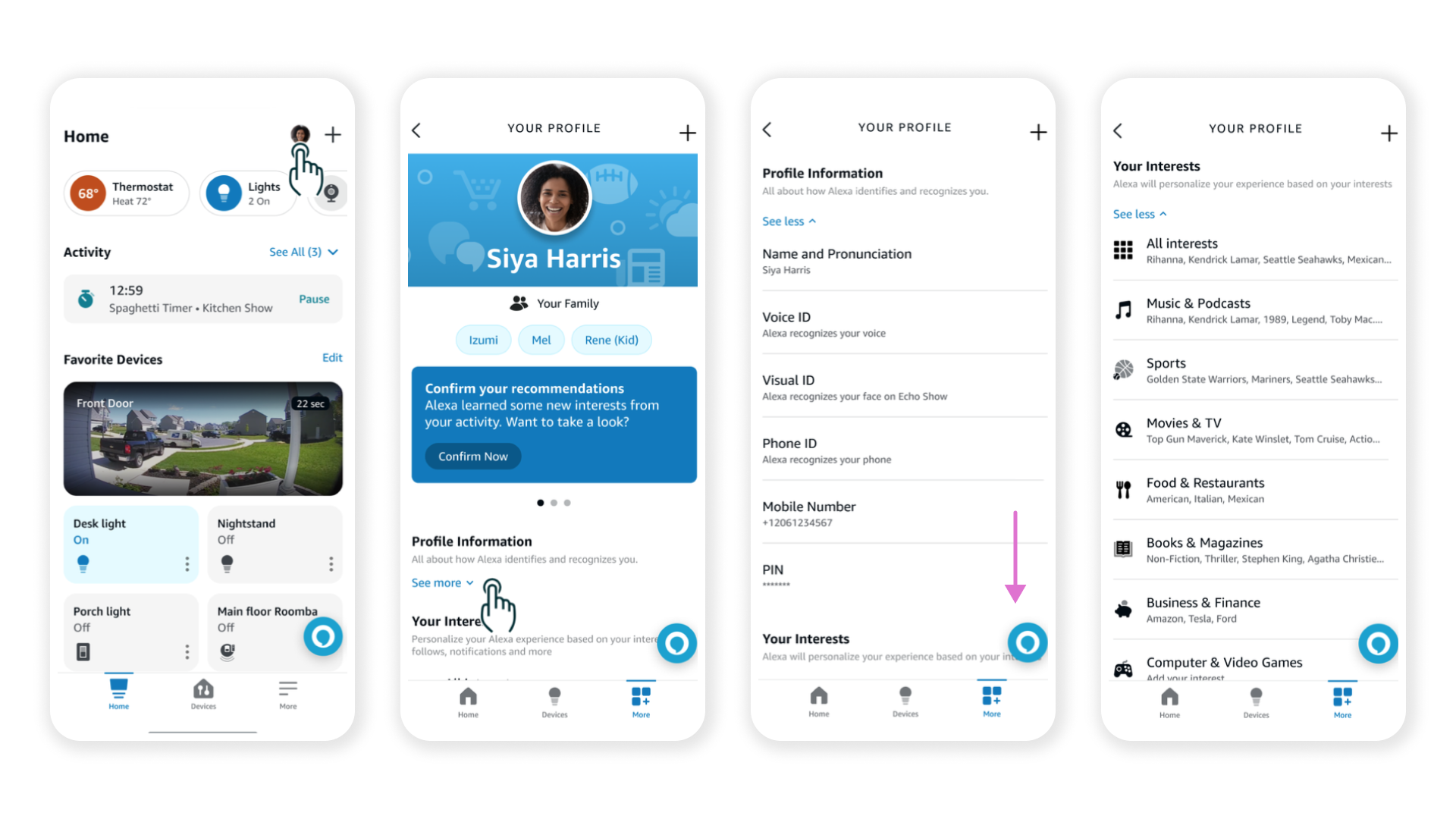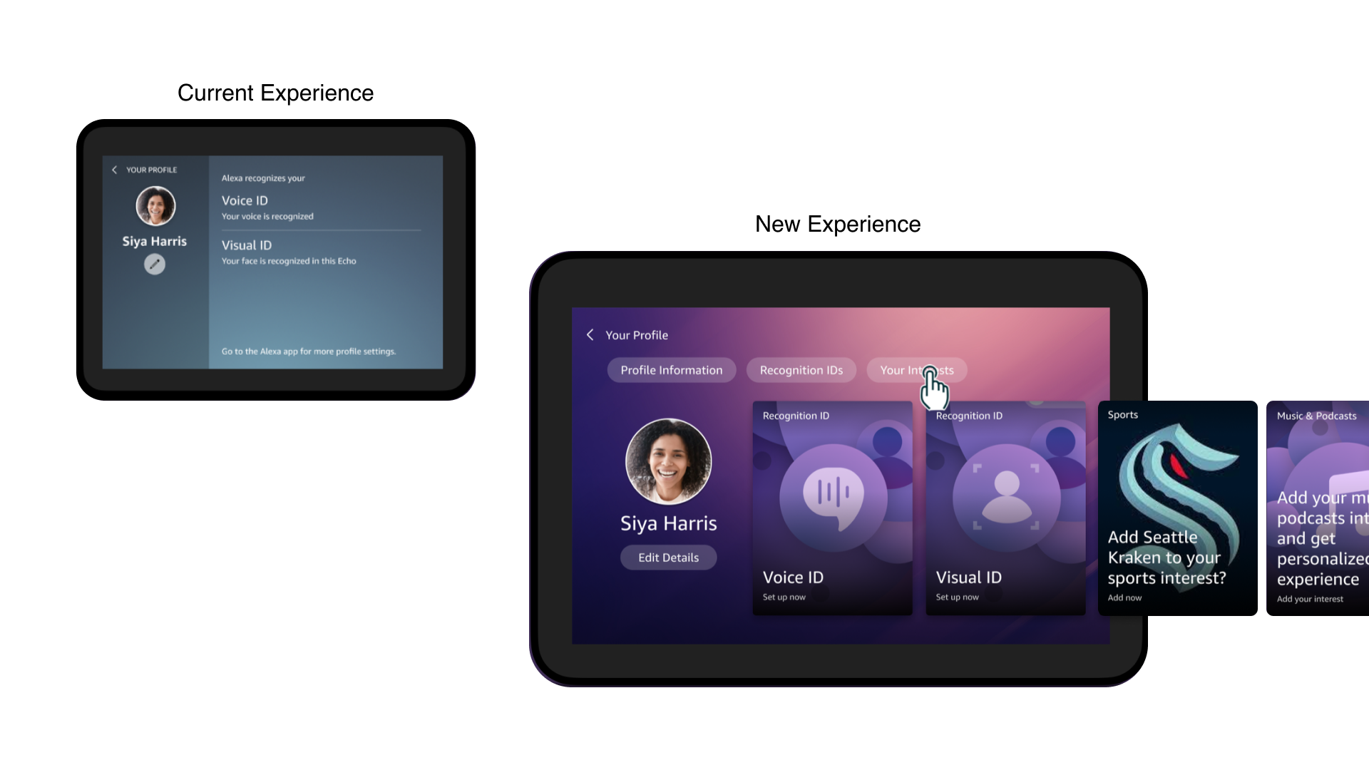 I spearheaded the ‘Alexa personalization’ project, which aimed to redefine the personalization primitives for Alexa, encompassing profiles, recognition, and preferences. The project’s objective was to enhance the profile experience within the app and across multiple modalities, enabling customers to conveniently manage all their personal settings, such as recognition IDs, preferred calendars, and interests, in a single location.