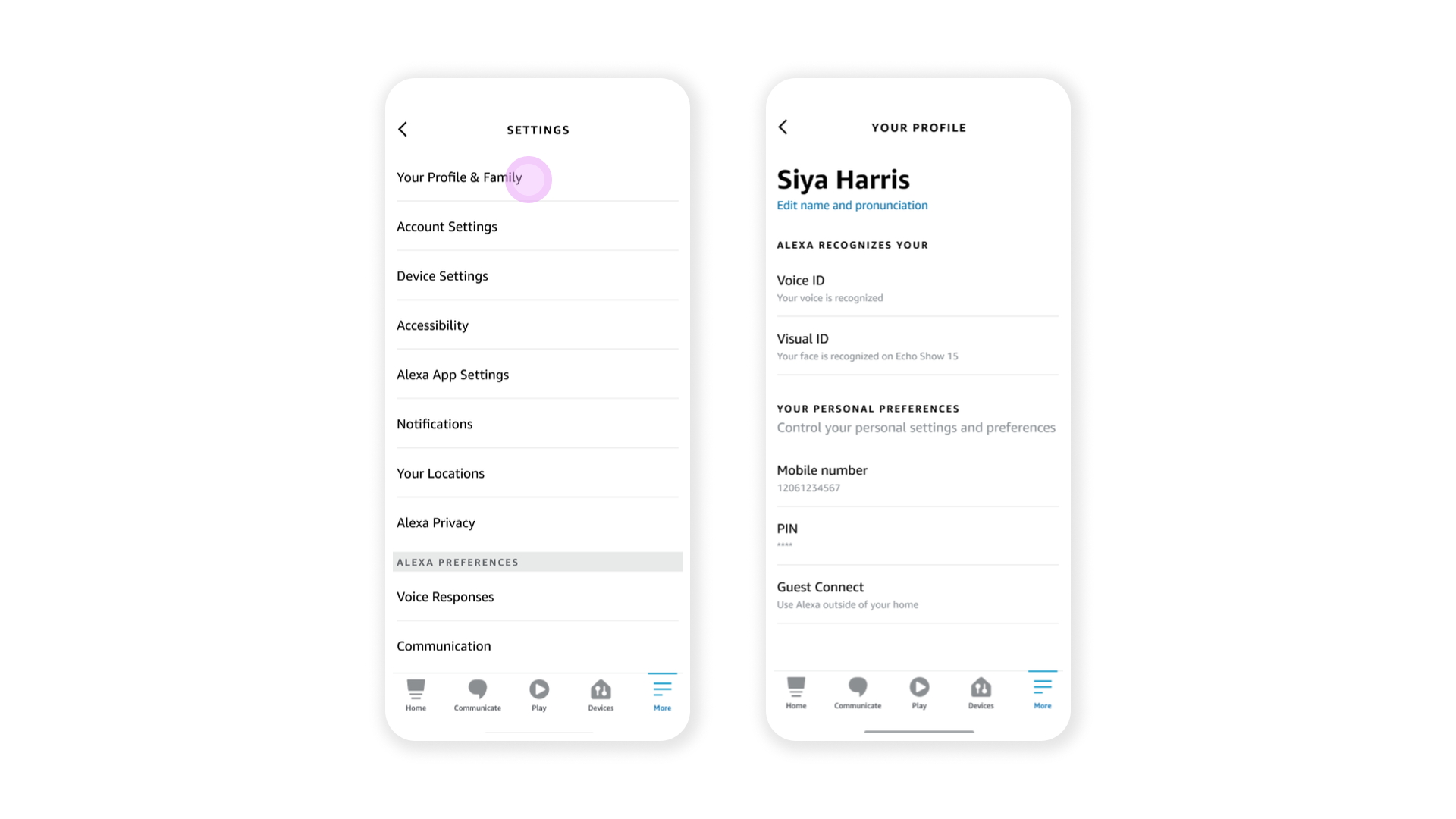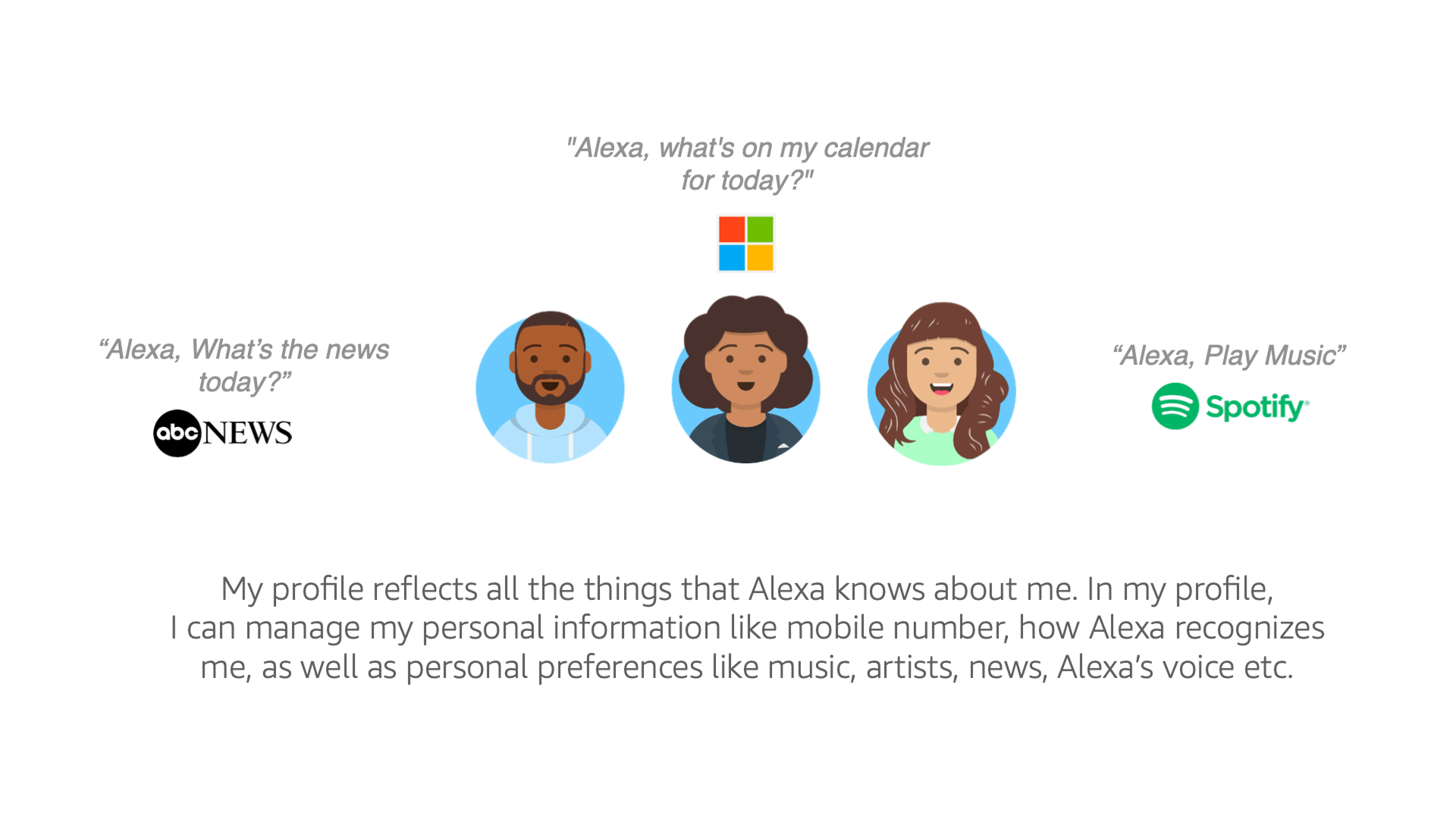 Consolidate all personal settings into the profile page, including personal calendar, music provider, Alexa’s voice, and more.